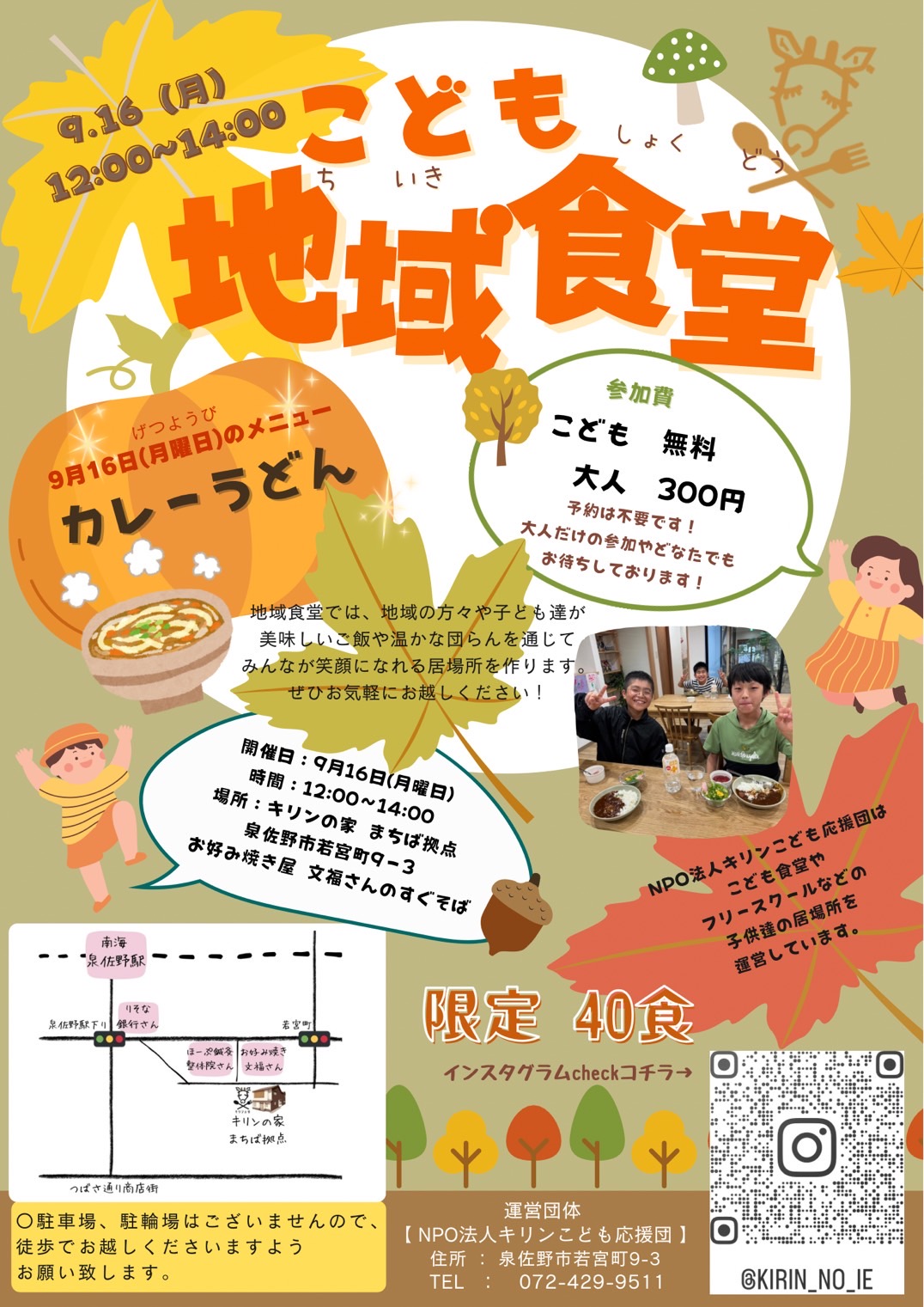 2024.9.4・キリンこども応援団🌰9月の地域食堂開催のお知らせ🌰