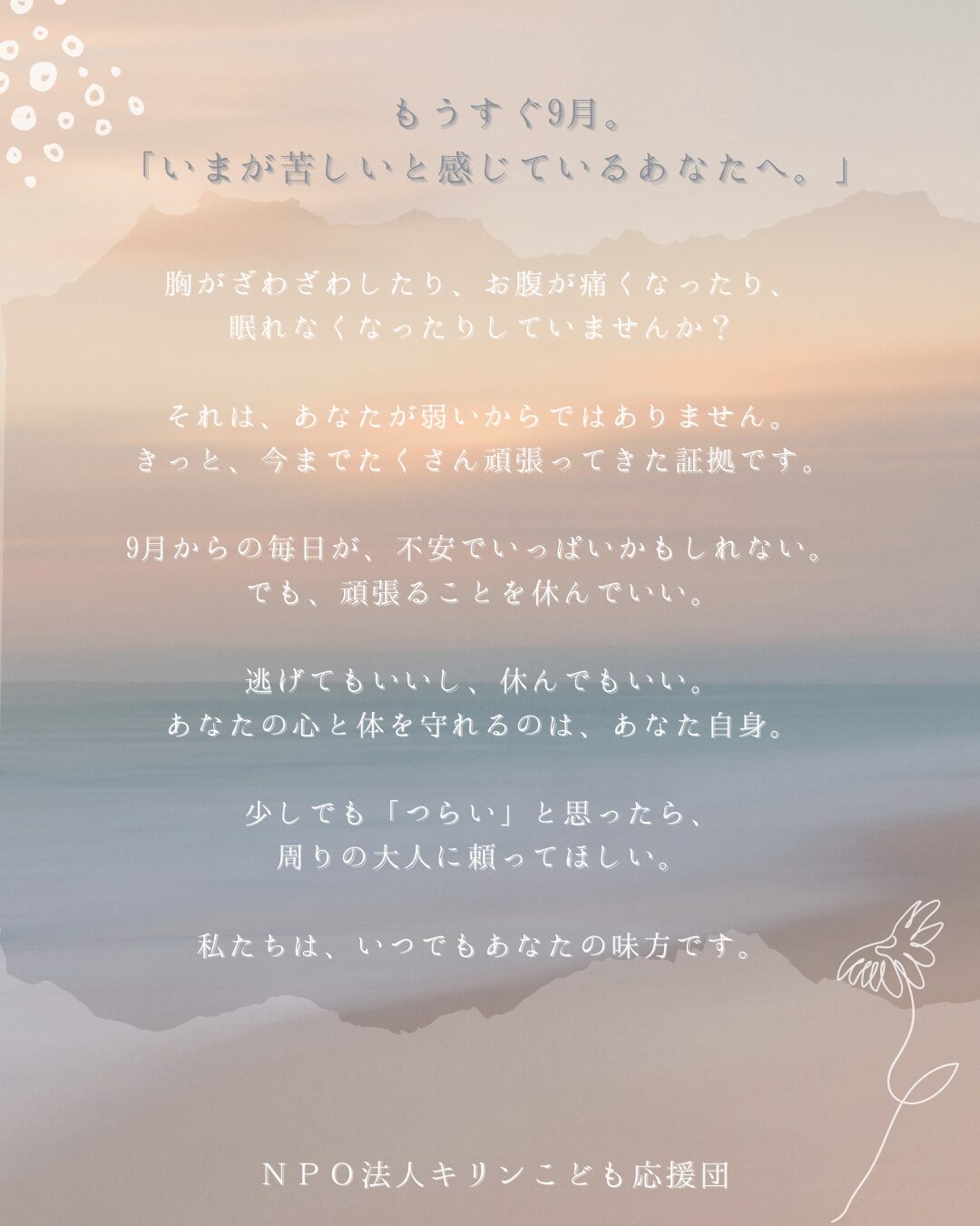 2025.8.24・キリンこども応援団9月に入るこの季節は子どもたちにとって大きな不安や緊張を抱える季節でもあります。