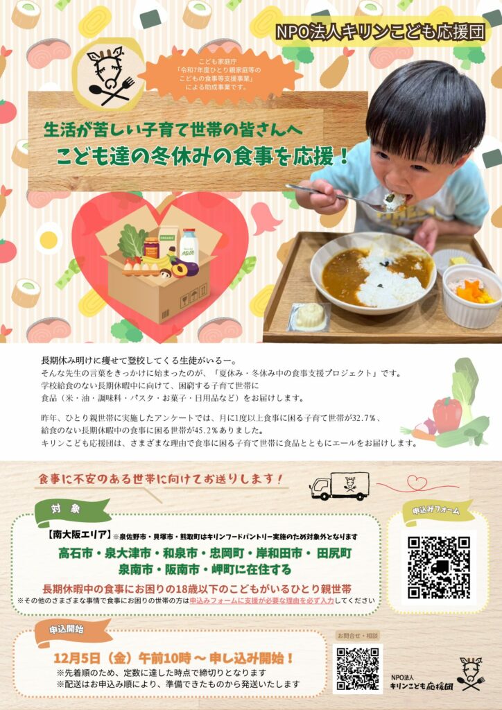 2025.12.3・キリンこども応援団もうすぐ冬休み! 学校給食のない長期休暇中、食事にお困りではないですか? 高石市・泉大津市・和泉市・忠岡町・岸和田市・ 田尻町・泉南市・阪南市・岬町にお住まいで、 18歳以下のお子さまがいるひとり親世帯、 その他さまざまな事情で食事にお困りの子育て世帯に 食品とエールをお届けします! (ご自宅への配送となります) お申込みは、12月5日(金曜日)午前10時から★ ※先着順のため、定数に達した時点で締切となります 皆さまからのお申込みをお待ちしております! お申込みはコチラから