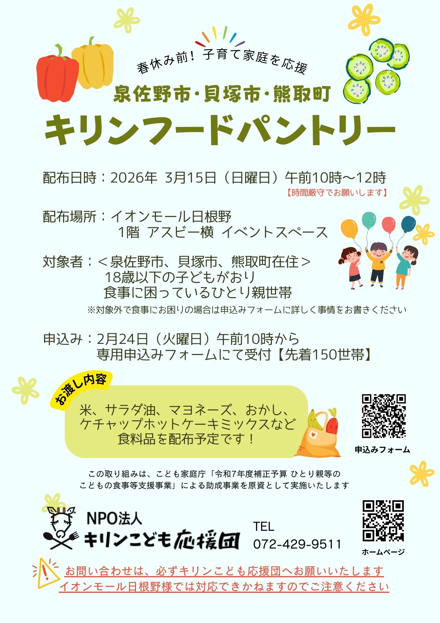 2026.2.21・キリンこども応援団― 春休み中の食事にご不安はありませんか? ― 泉佐野市、貝塚市、熊取町にお住まいで 18歳以下のお子さまがおり 食事にお困っているひとり親世帯を対象に 【キリンフードパントリー】を実施いたします! ◇配布日時: 3月15日(日曜日) 午前10時~12時 ◇配布場所: イオンモール日根野 1階 アスビー横 イベントスペース 【事前申込制】 先着150世帯 2月24日(火曜日)午前10時から 専用申込みフォームにて申込受付を開始いたします! <お申込みはこちらから> https://forms.gle/k4swZYPc8oAJWGj19 ※お申込時は、記入内容に不足がないよう ご注意ください ※当日は12時を過ぎますと キャンセル・受取不可となります ※お問い合わせは、必ずキリンこども応援団 (TEL 072-429-9511)までお願いします (イオンモール日根野様では対応できかねます)
